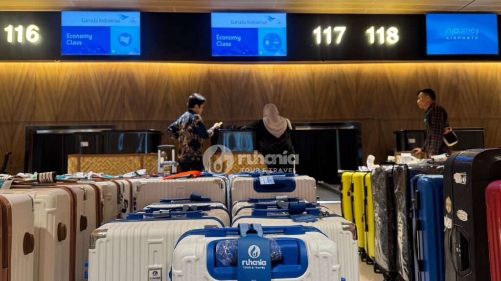 Barisan koper jamaah Ruhania Tour & Travel yang tertata rapi di konter check-in Bandara Soekarno-Hatta
